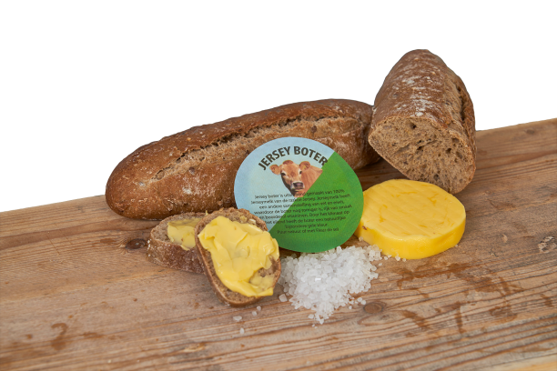 Onze Jersey boter is uitsluitend gemaakt van 100% Jerseymelk van de raskoe Jersey. Jerseymelk heeft een andere samenstelling van vet en eiwit, waardoor de boter nog romiger is, rijk aan smaak en boordevol vitaminen. Door het klimaat op het eiland Jersey heeft de boter een natuurlijke bijzondere gele kleur. Samen met het Fleur de Sel zout, maakt deze boter tot een hoogwaardig product.