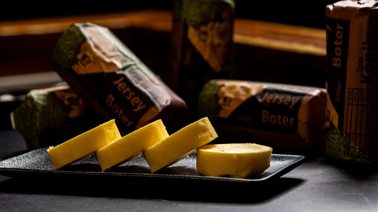 Onze Jersey boter is uitsluitend gemaakt van 100% Jerseymelk van de raskoe Jersey. Jerseymelk heeft een andere samenstelling van vet en eiwit, waardoor de boter nog romiger is, rijk aan smaak en boordevol vitaminen. Door het klimaat op het eiland Jersey heeft de boter een natuurlijke bijzondere gele kleur. Samen met het Fleur de Sel zout, maakt deze boter tot een hoogwaardig product.