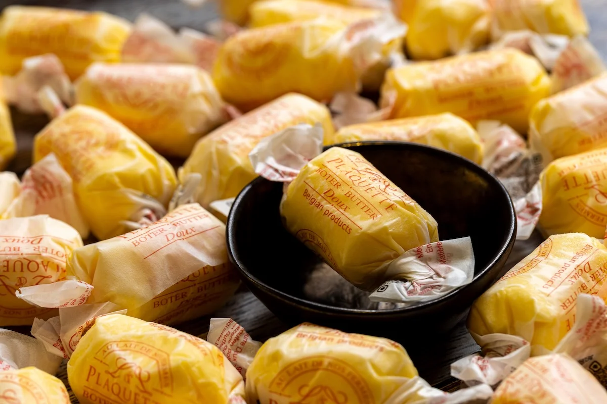 Deze met perkament verpakte Roomboter Toffee’s uit de Ardennen zijn geheel uniek en milieubewust met een ambachtelijke uitstraling. De ‘toffee’s’ zijn verpakt in geheel plasticvrij, plantaardig perkamentpapier. Ze worden handmatig verpakt met hulp van mensen met een handicap of afstand tot de arbeidsmarkt. De porties van 10 of 20 gram zijn perfect voor 1 of 2 personen en daarmee ideaal voor bij ontbijt, lunch of diner.